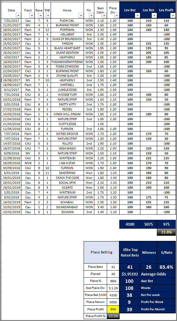 The stats are simply awesome. 49.5% winners and 75% placegetters from 299 bets. The PLACE net profit is 21.6%. That is sensational profit considering the average odds of the winners was $3.75.