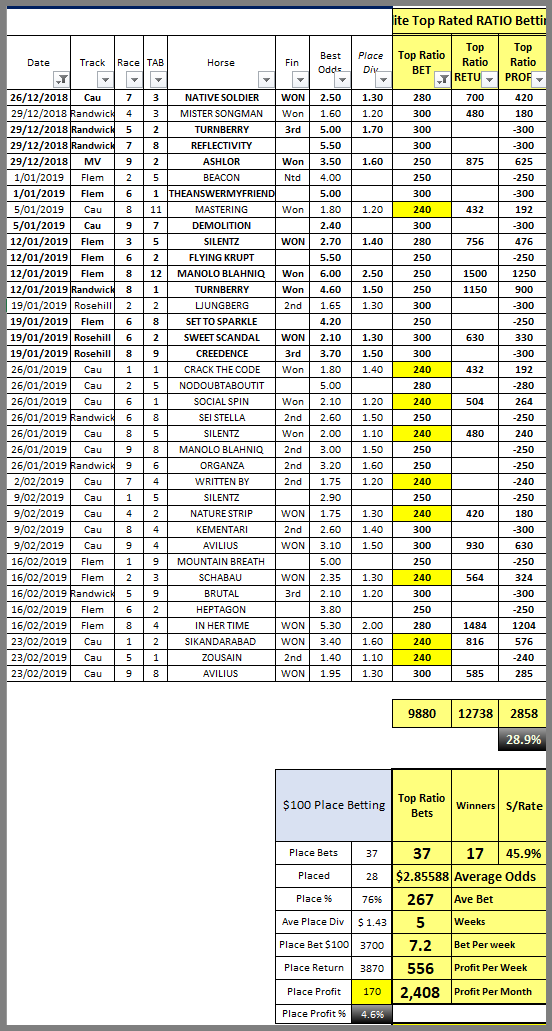 I hope I have provided food for thought and maybe some motivation to at least explore the place betting potential of the best Top-Ratio qualifiers. There are plenty of win all-up doubles and the leverage can make for some big returns. eg: Manolo Blahniq into Turnberry on Jan 12th returned $2760 for $100 win all-up.