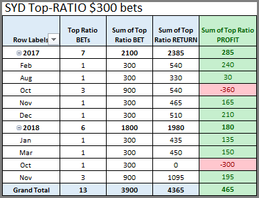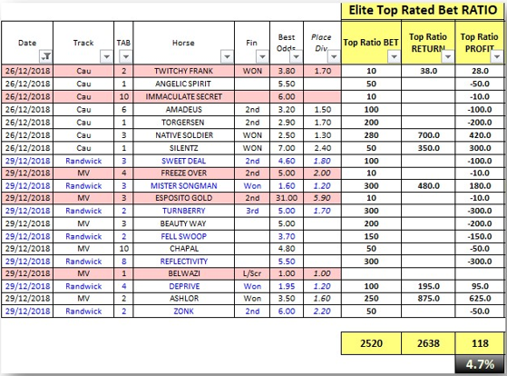 A: Any late instruction and more detailed results will be emailed during the coming days. The latest version of the Top-Rated Mel-Syd Master Spreadsheet is attached along with the complete list of our 1514 Top-Rated selections over 2017-2018 with the Top-Rated Bet Ratio information.