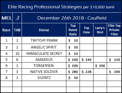 The Top-Zone continues to be the flagship professional strategy for Melbourne. Time will tell but I think this is going to be challenged as the preferred ‘main strategy’ by the new Elite Top-Rated ratio bets where members can bet on ALL top-raters – the Top-Zone rejects 75% of the Melbourne Top-Raters.