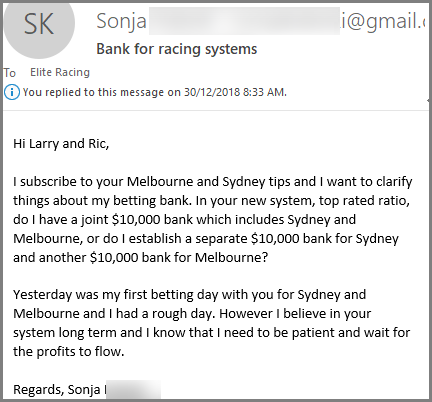 We are going to present ALL the raceday betting information in one list for Melbourne and one list for Sydney. There is no need for special notations and colour coding for ‘danger’ races or a separate elite-top email. We will provide raceday examples before the end of the year – before we get started.