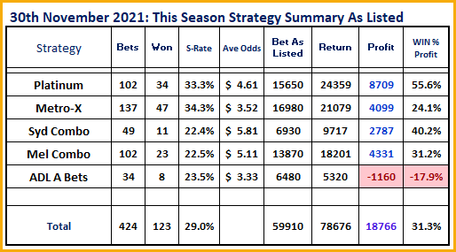 These are simply extraordinary stats considering the problematic weather (in both States, racing has been on G4 to H10), many non-city meetings and the Melbourne spring carnival.