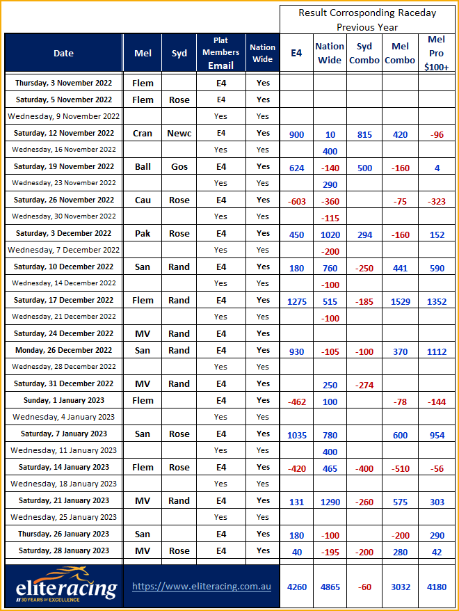 Platinum members get the E4 list of bets each raceday as well as full access to Mel and Syd.